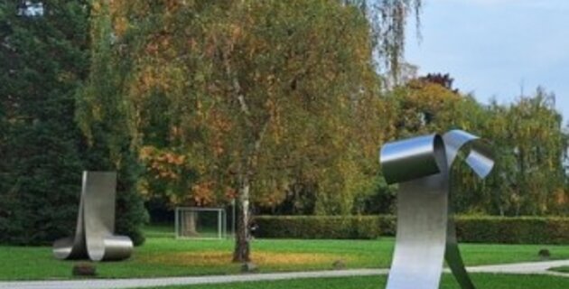 Ein besonderes Highlight ist die Leihgabe des Bildhauers Stephan Goedecke. „Eins oder doch nicht eins“, das aus zwei Teilen bestehende Kunstwerk aus Stahl. Zwei einfache, stille archaische Formen. Alles ist sichtbar: die Ausgangsform der Stahl Tafeln, der einfache Schwung der auf den zweiten Blick seine Nuancen offen legt. Das macht die Skulptur und das Material lebendig und fließend. Der Sinn kommt durch die Gegenüberstellung der beiden Formen. Die einfache Grundform taucht in dem anderen Teil in umgekehrter Form auch auf: „Eins oder doch nicht eins“.