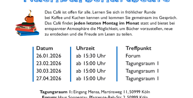 Das Café ist offen für alle. Lernen Sie sich in fröhlicher Runde bei Kaffee und Kuchen kennen und kommen Sie gemeinsam ins Gespräch. Das Café findet jeden letzten Montag im Monat statt und bietet bei entspannter Atmosphäre die Möglichkeit, um Bücher vorzustellen, neue zu entdecken und die Freude am Lesen zu teilen. Ich bitte um Anmeldung bis zum Donnerstag vor dem jeweiligen Café.
